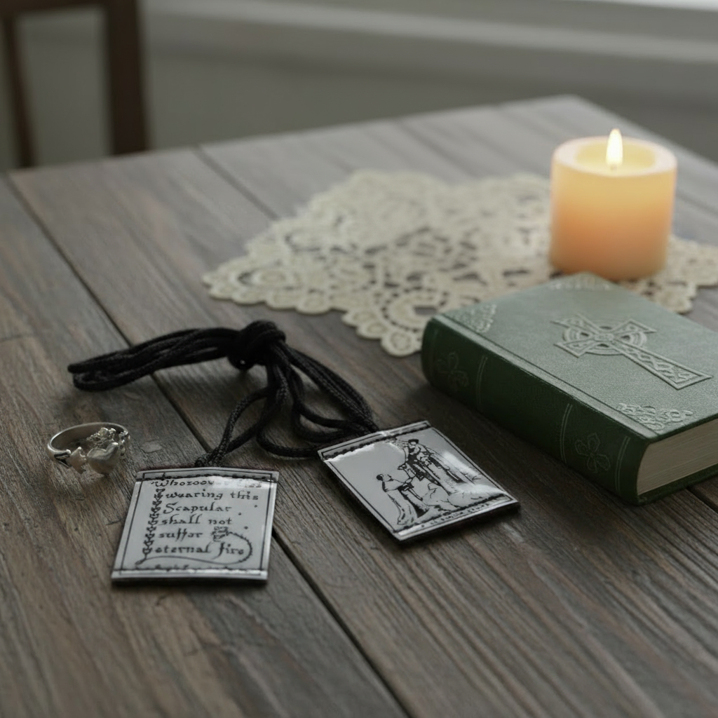 The Brown Scapular consists of two small pieces of brown cloth , joined by string and worn over the shoulders, front and back. It was first made known by Our Lady Herself, July 16th 1251, to St. Simon Stock, Vicar General of the Carmelite order. The Scapulars we supply are made from 100% pure woven wool and last for many years.