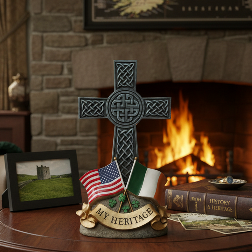 Celebrate faith, history, and Irish-American heritage with this beautifully crafted Celtic cross statue, featuring both the Irish and American flag